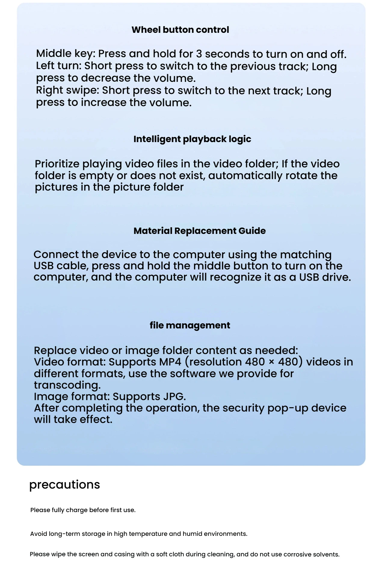 1. USB version: Download conversion software on a computer to convert videos to MP4 format, then upload videos or pictures to the product through the computer. Only supports Windows system, not Apple system.